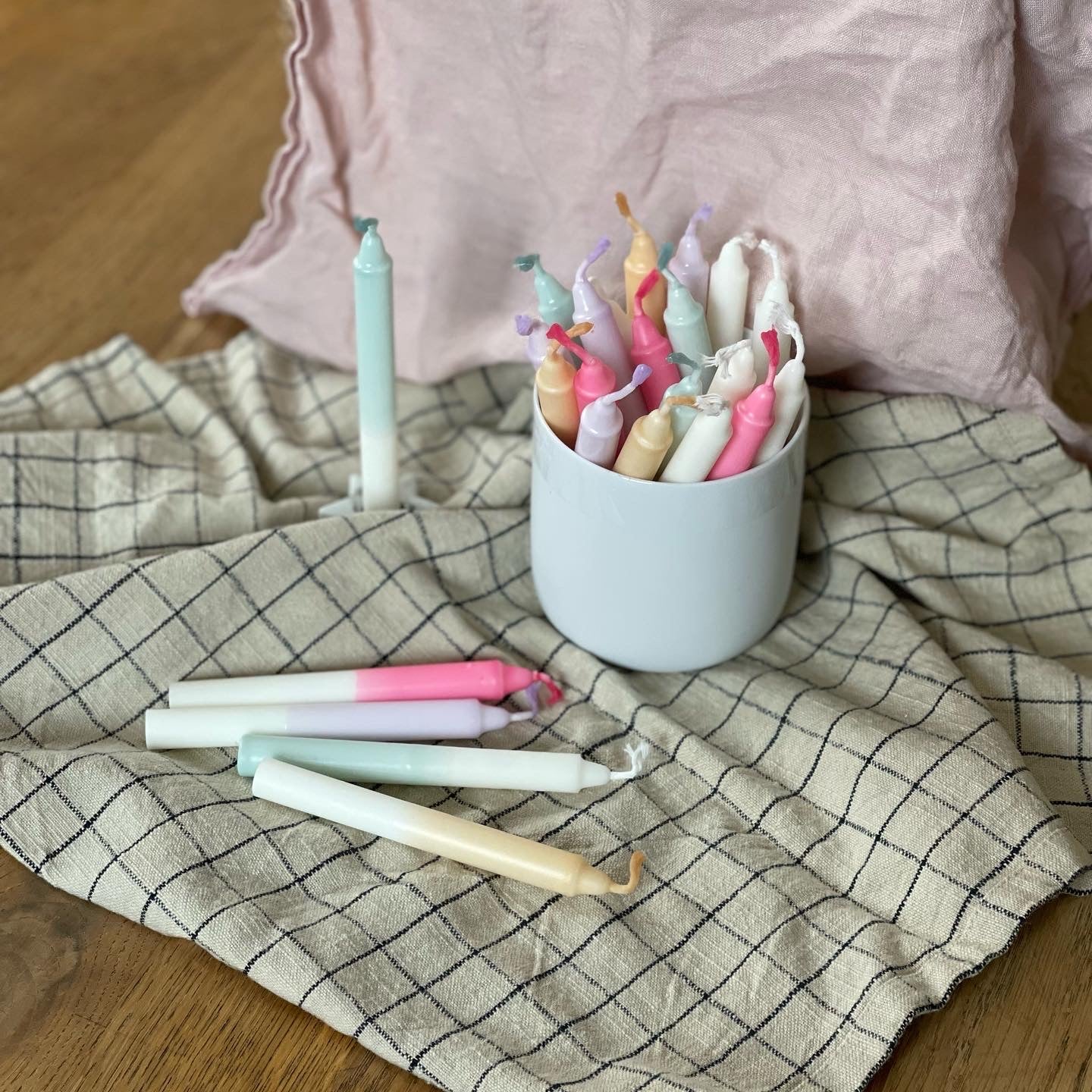 Enthalten sind: 24 handgetauchte Kerzen (ca. 11,5 cm lang, mit einem Durchmesser von ca. 12mm), ein Kerzenhalter in schwarz oder gold und ein Teebeutel für dein 1. Stündchen im Kerzenschein