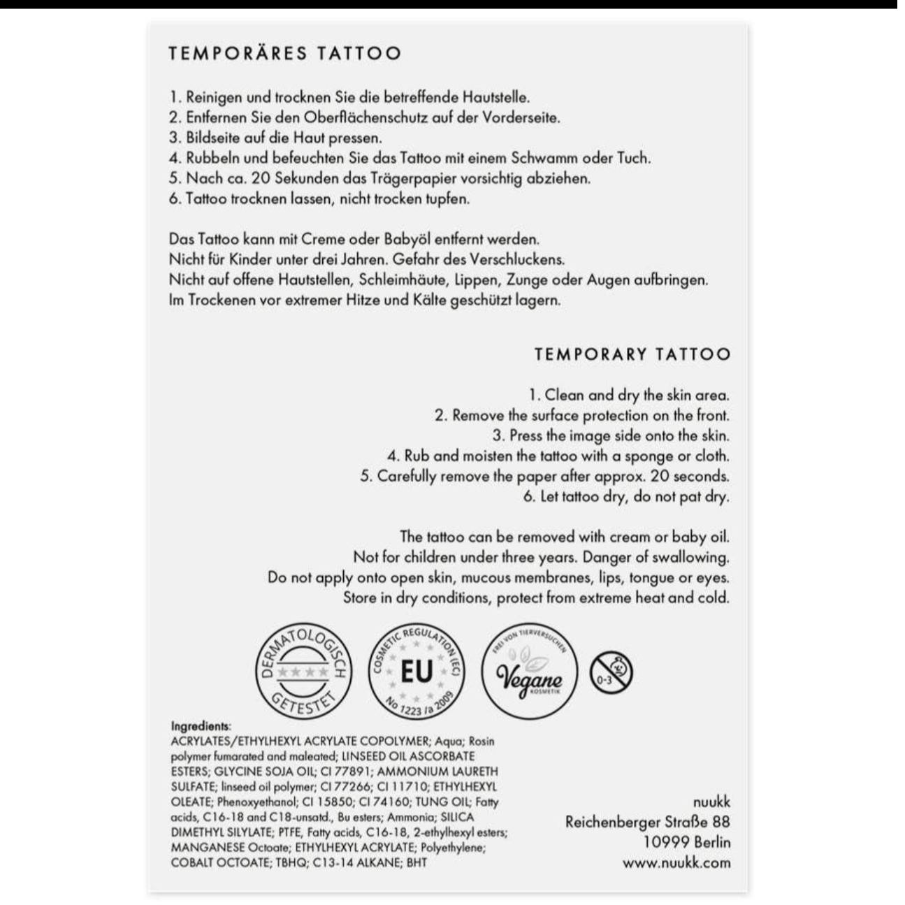 Material: vegane Wassertransfer-Tattoos, dermatologisch getestet
