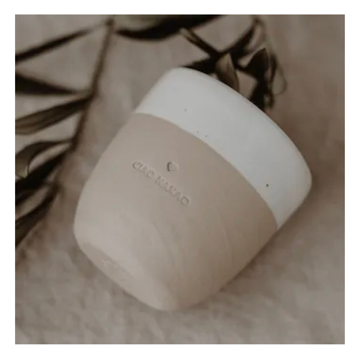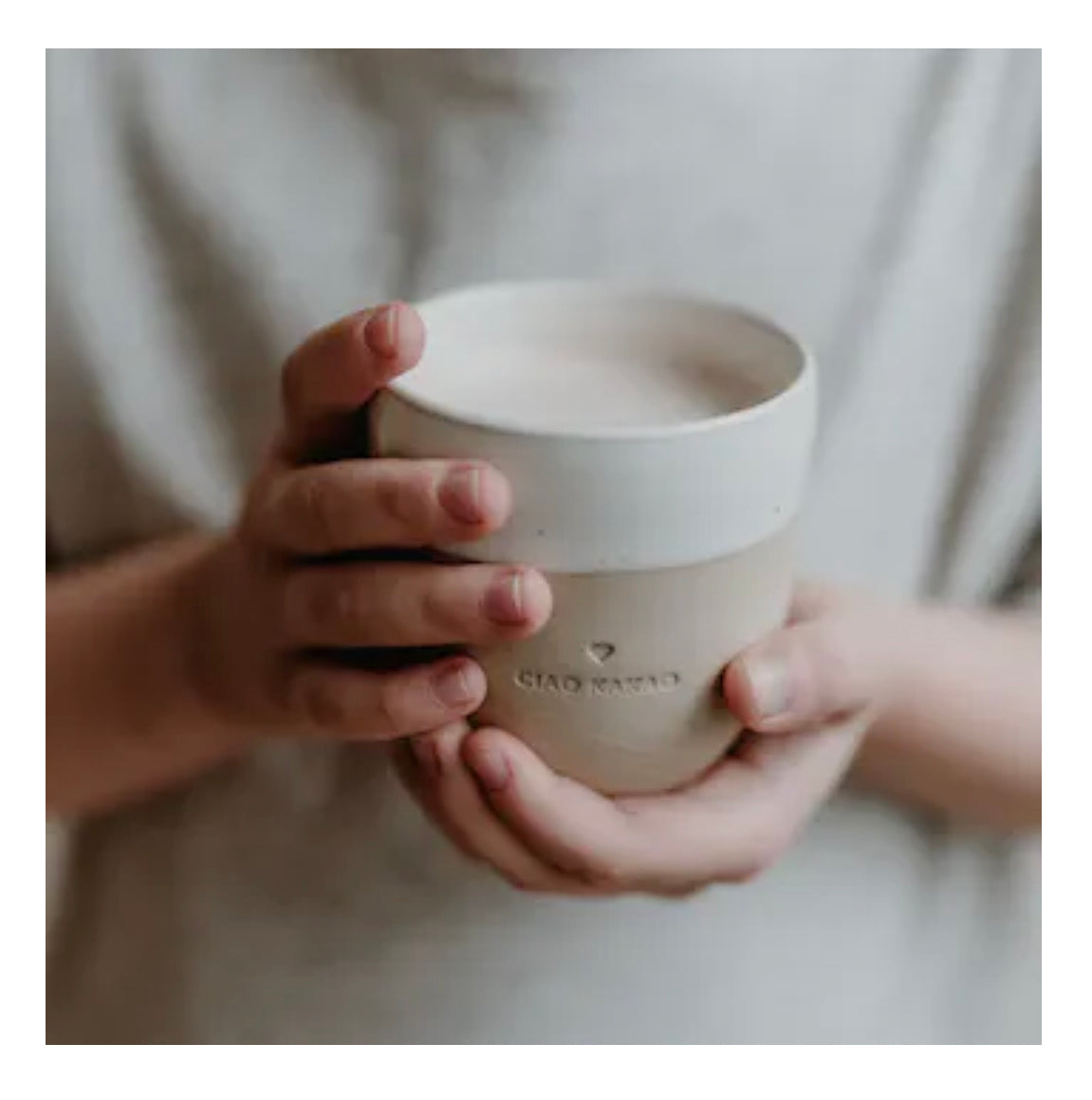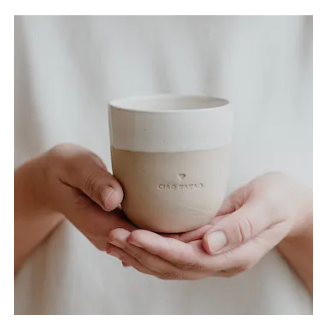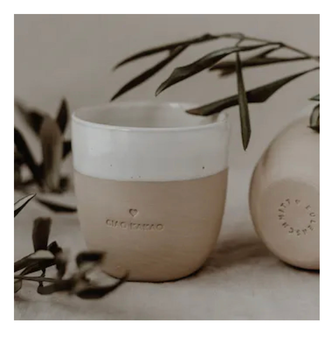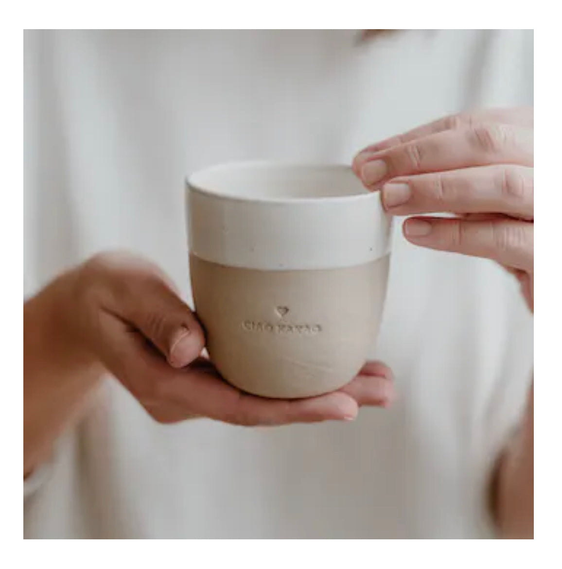 Wunderschöner Steingut Becher, hergestellt in einer kleinen Töpferei in Portugal, mit Prägung „🖤 ciao kakao“. Kein Becher gleicht dem nächsten zu 100%, das ist echte Handarbeit!