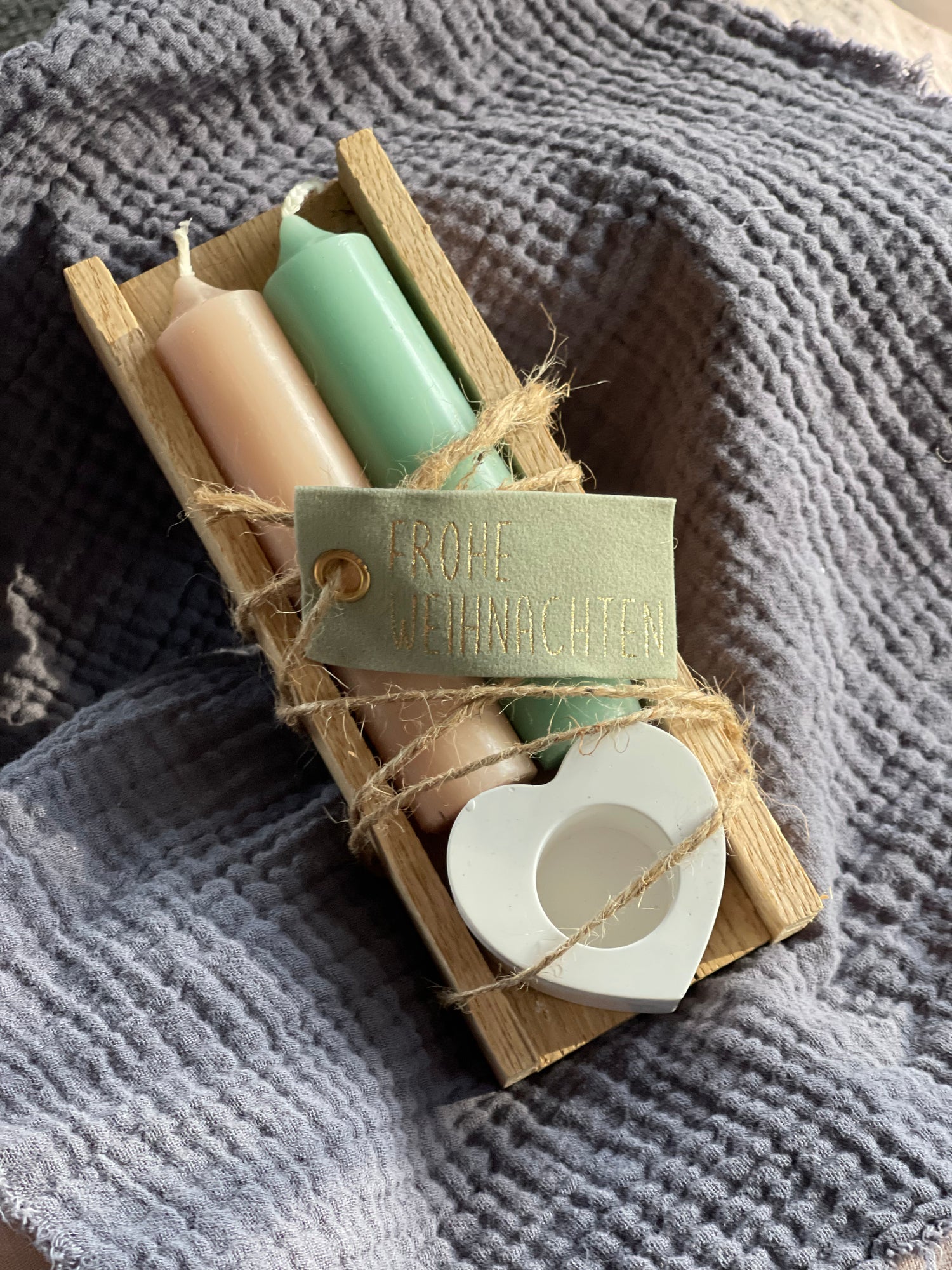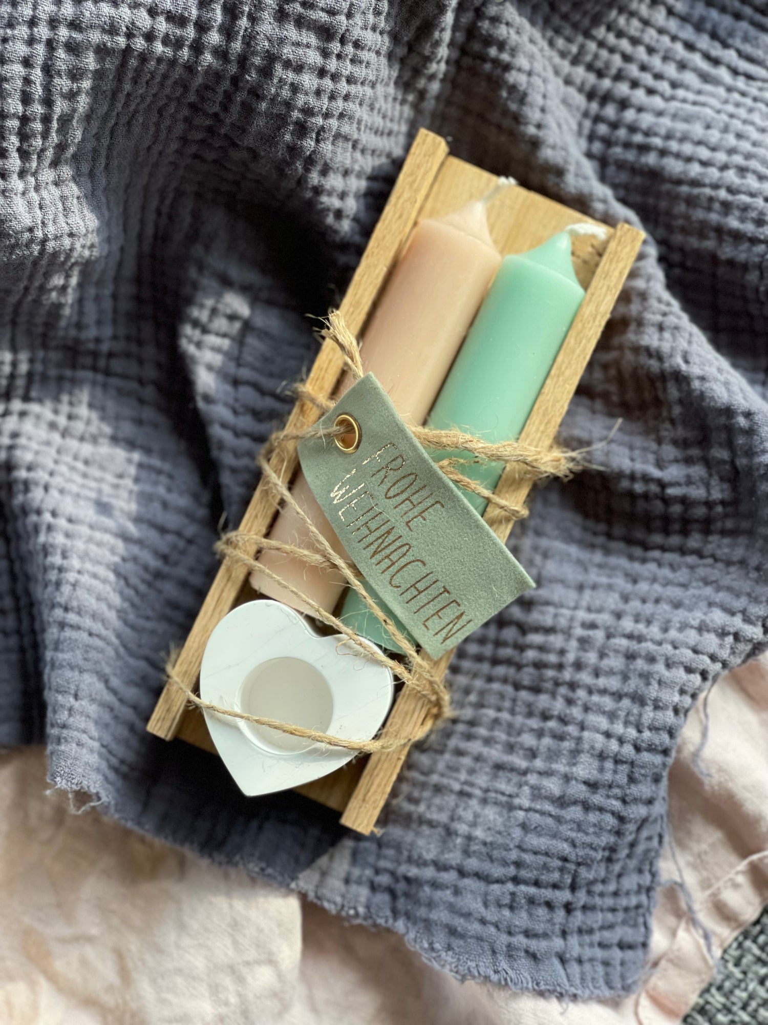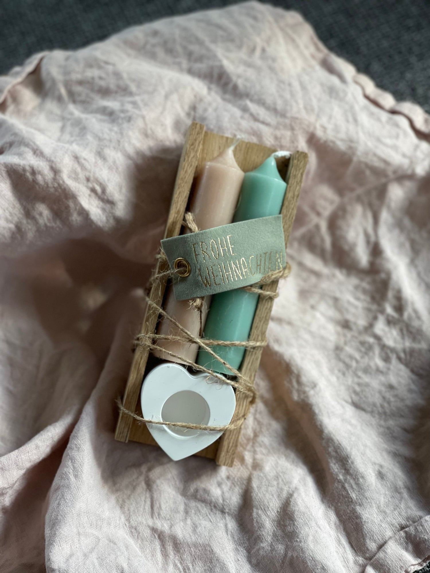 Set aus 🩶-Kerzenhalter und zwei kurzen Stabkerzen.
