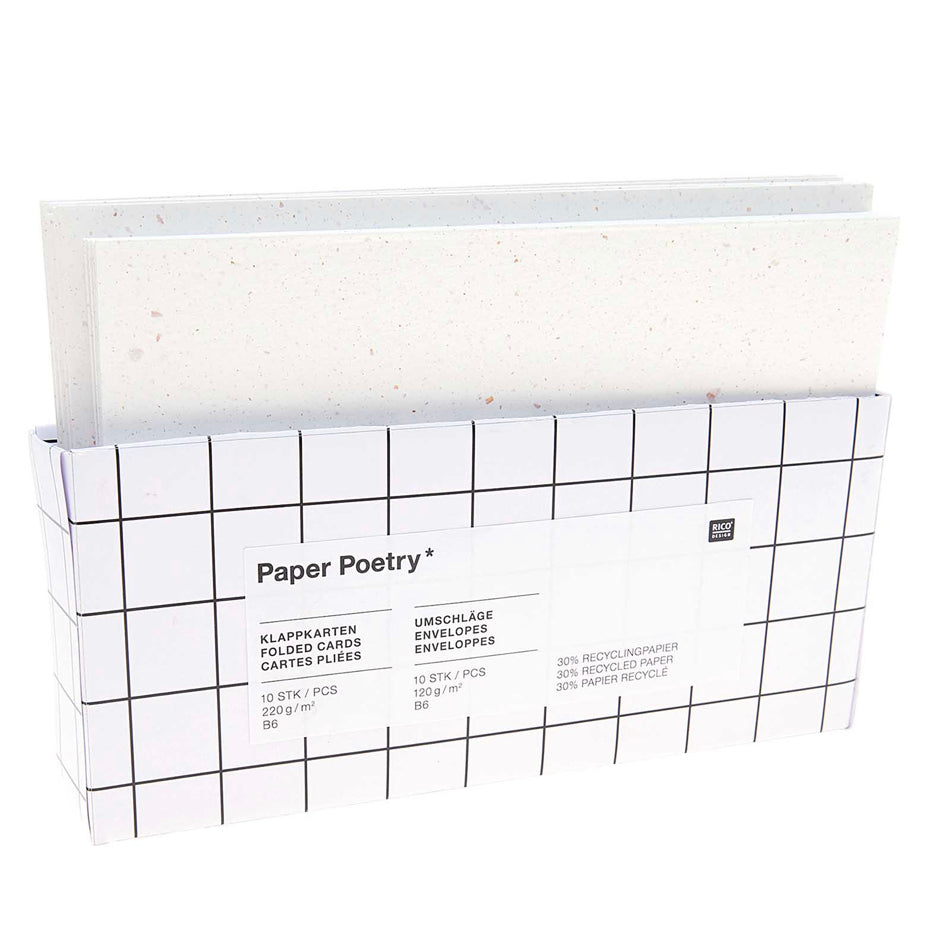 Das Kartenset im Format B6 enthält jeweils 10 Klappkarten und 10 Umschläge. Durch den Recyclinganteil von 30% erhält das Papier eine hübsche Maserung und einen hochwertigen, zeitgemäßen Look. Das Kartenset in der Farbe off white wird in einer stabilen Box mit PET-Deckel geliefert, die gleichzeitig als praktische Aufbewahrung dient.