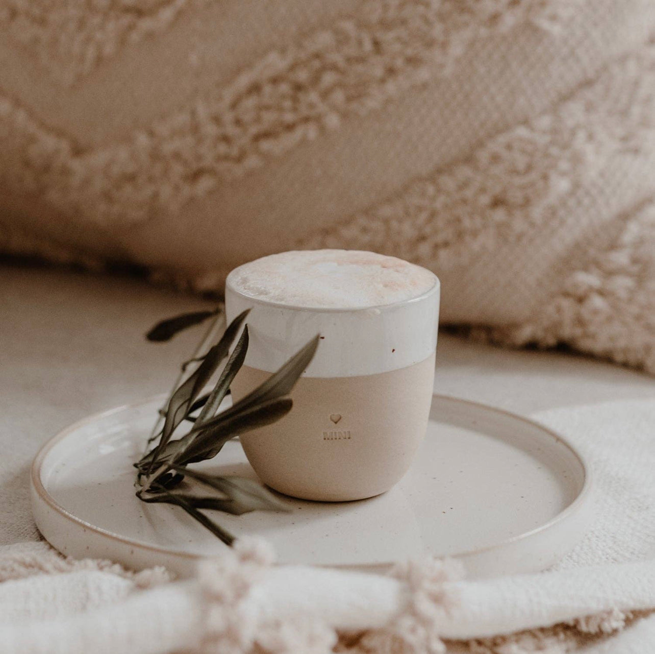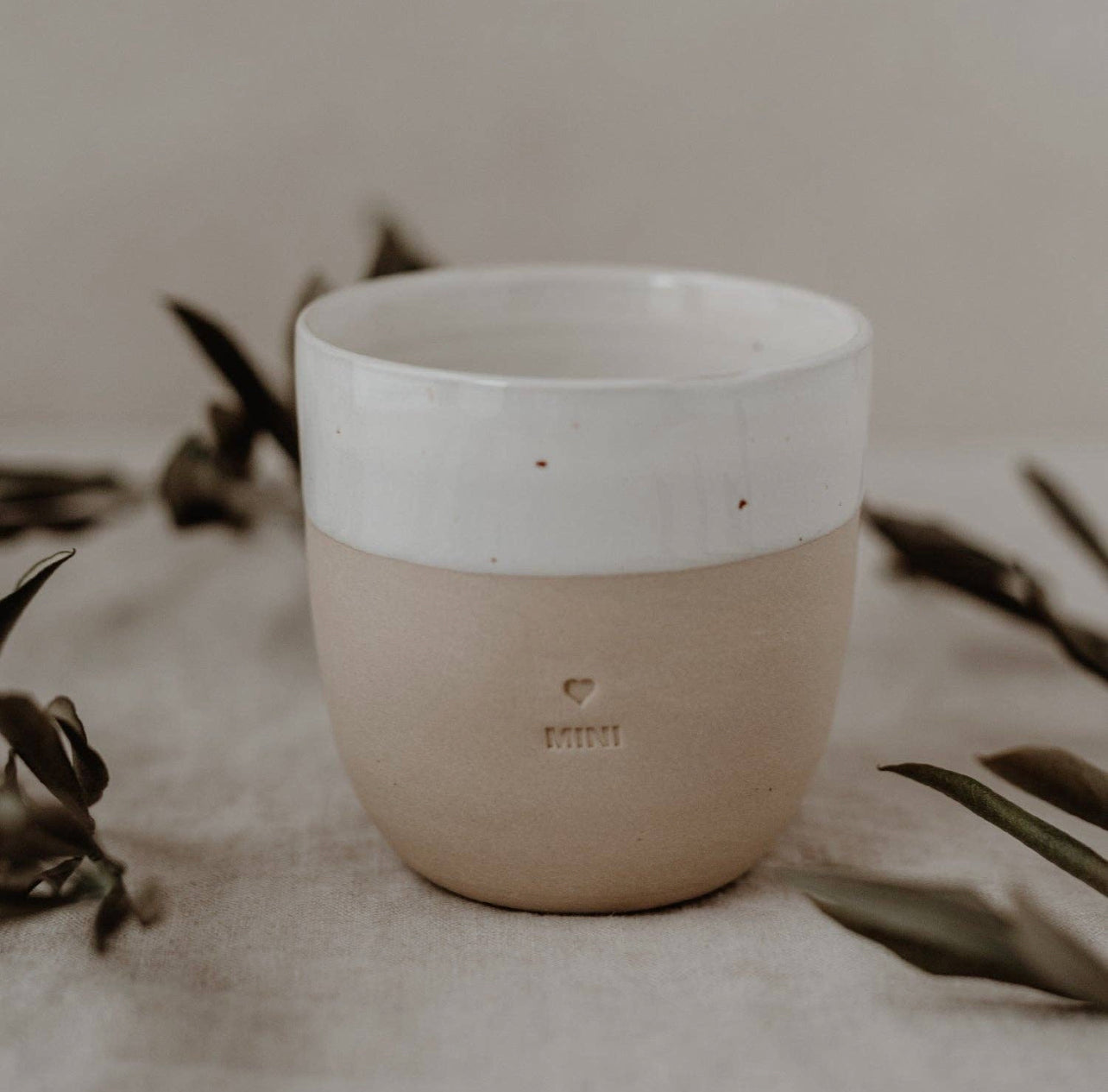 Wunderschöner Steingut Becher, hergestellt in einer kleinen Töpferei in Portugal, mit Prägung „🖤 mini“. Kein Becher gleicht dem nächsten zu 100%, das ist echte Handarbeit!